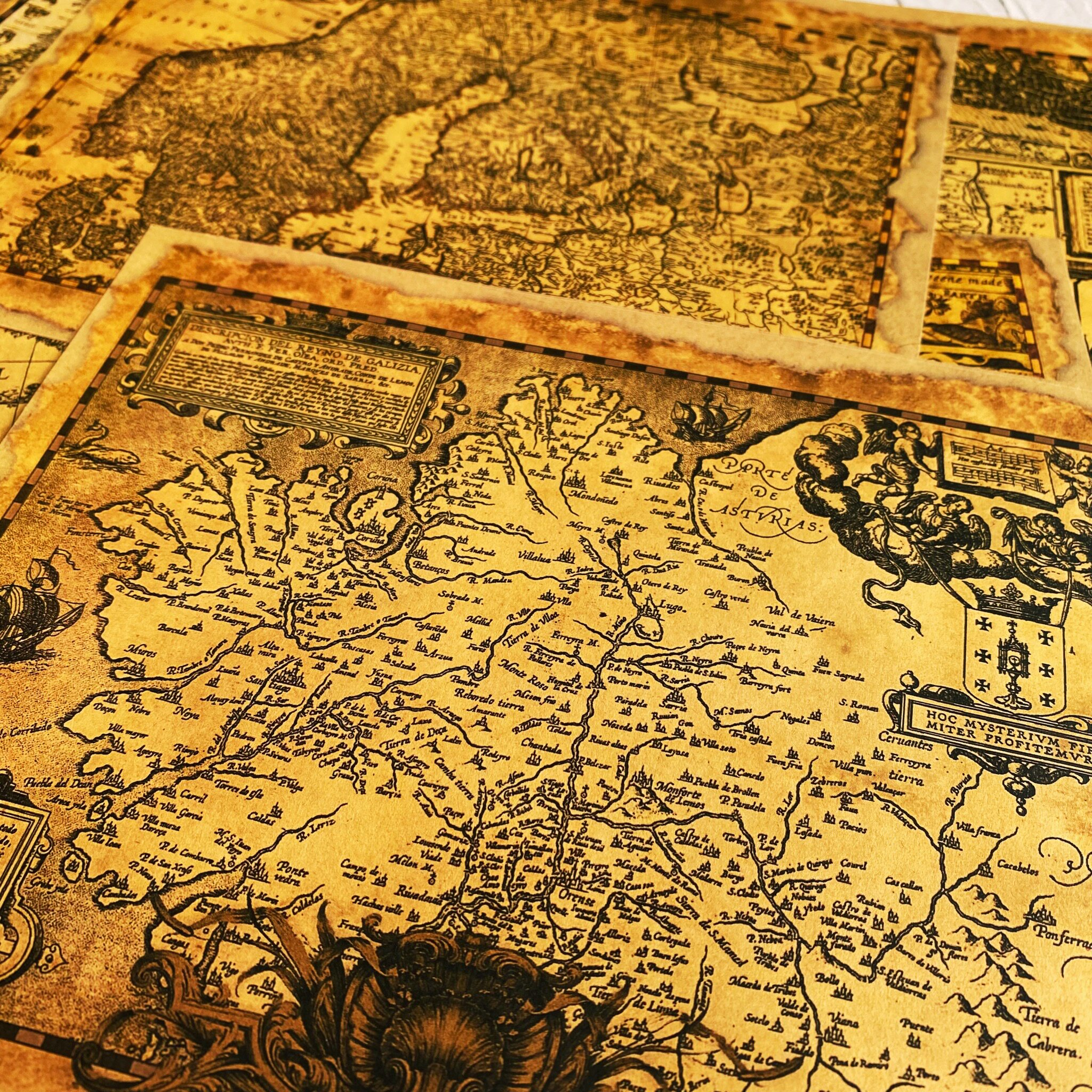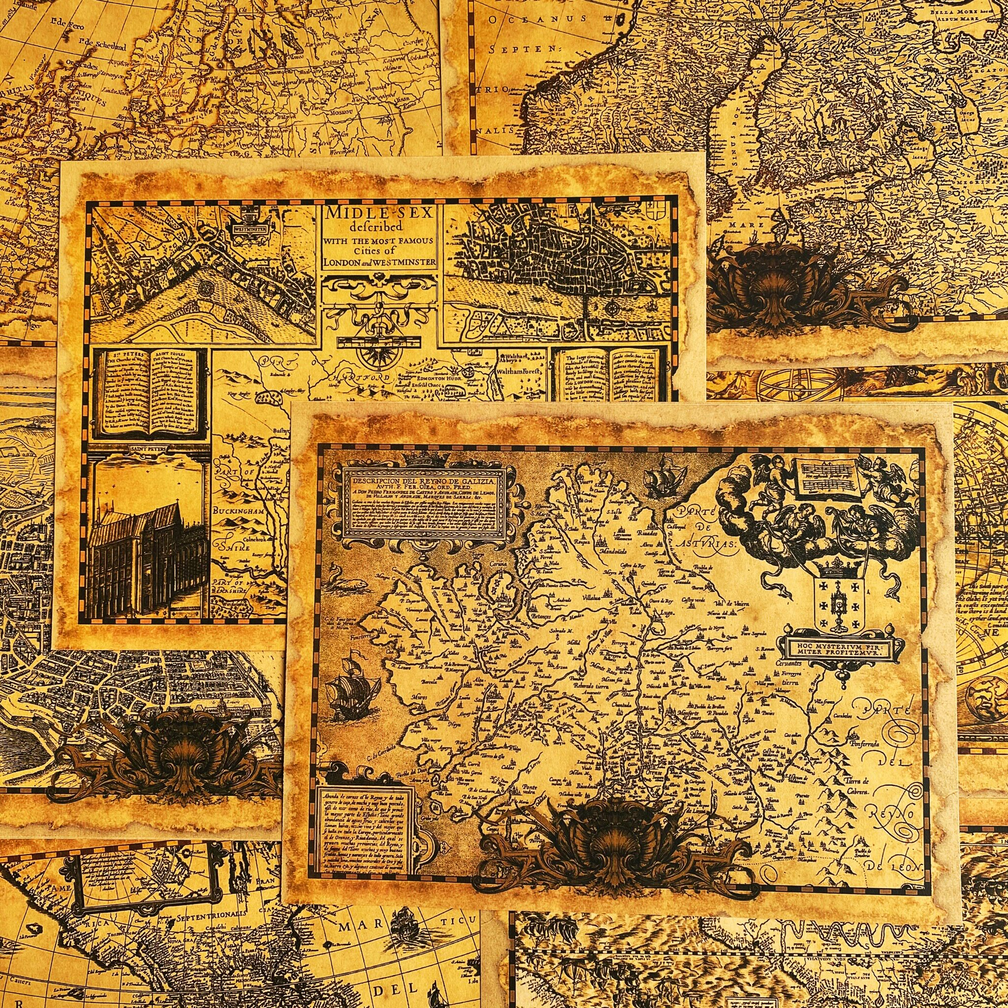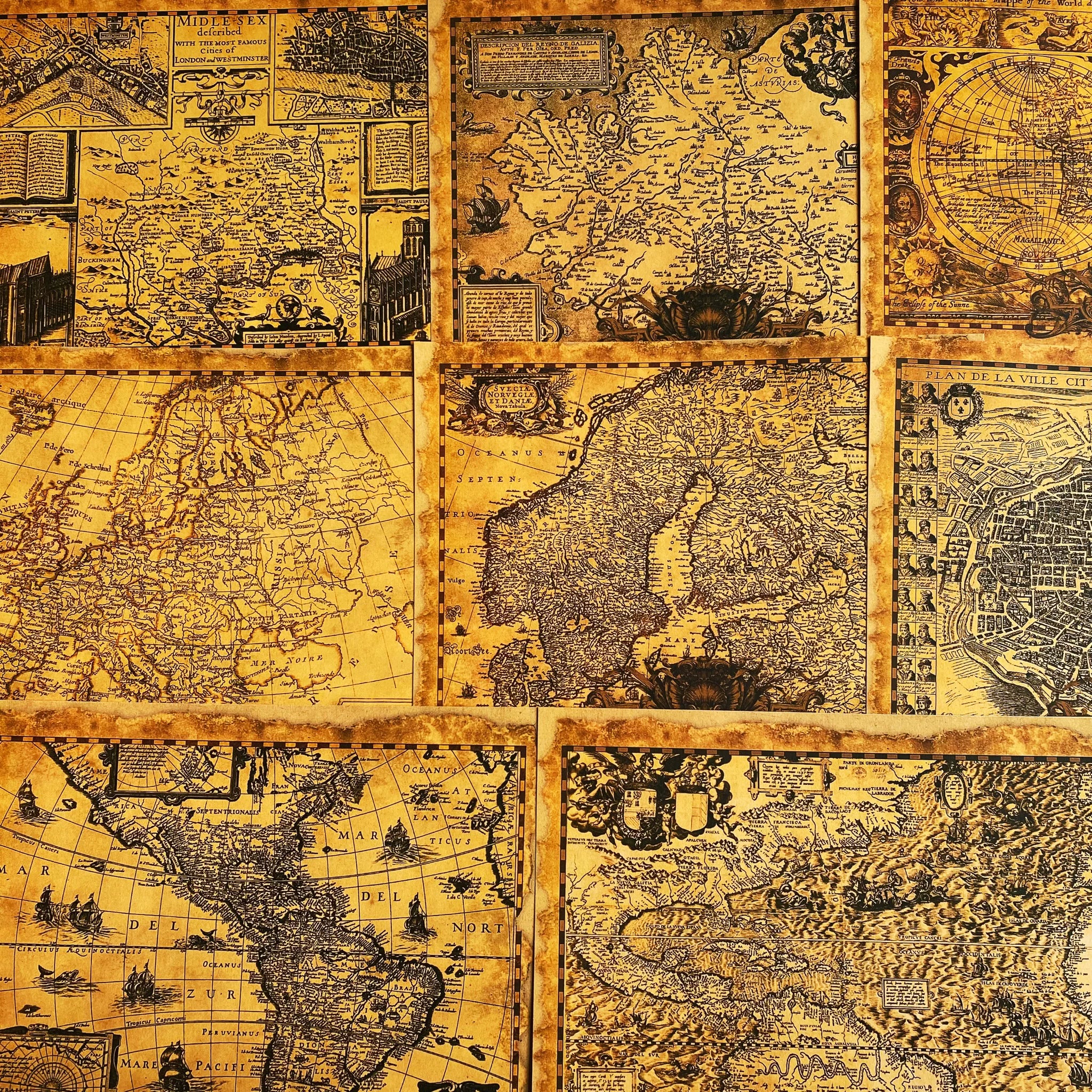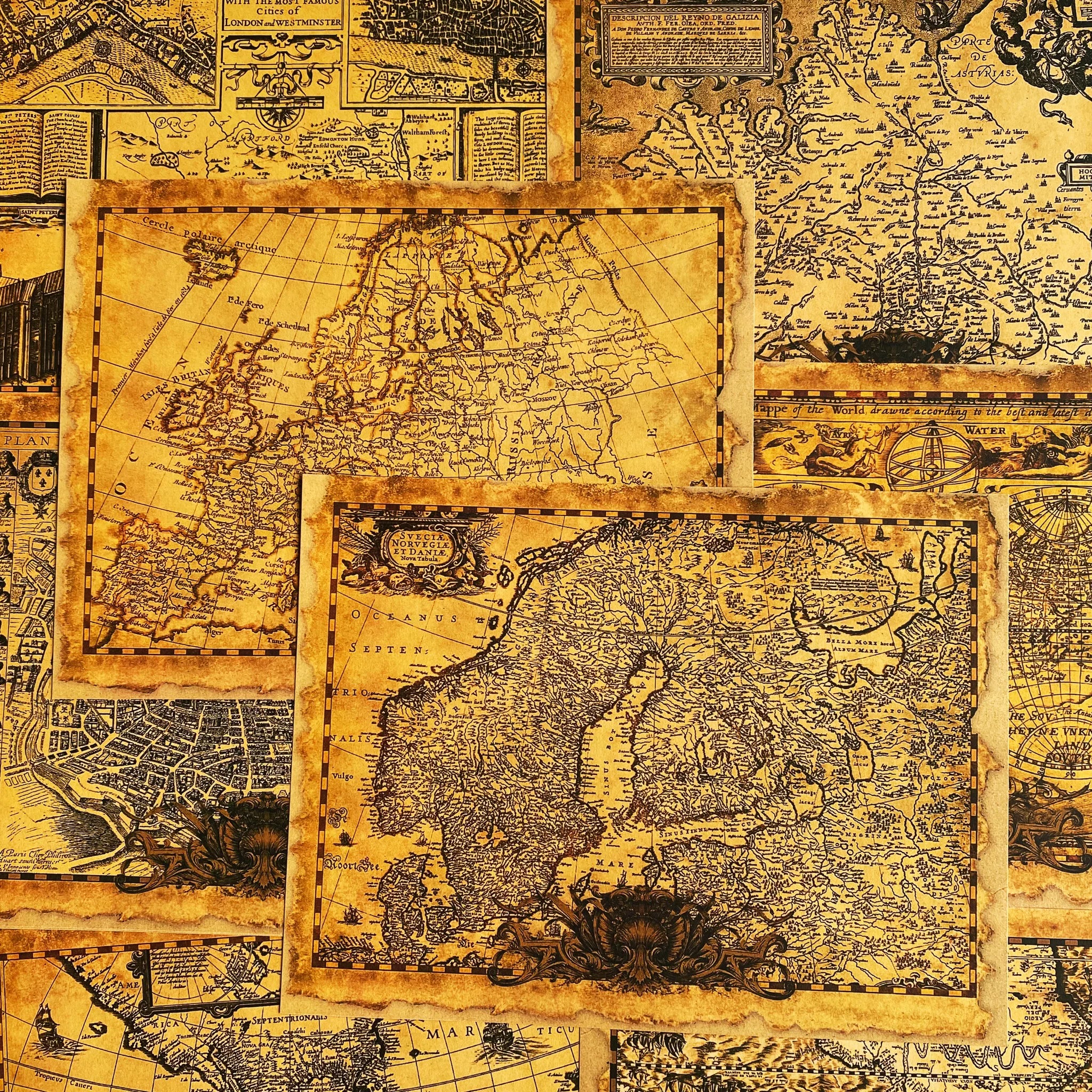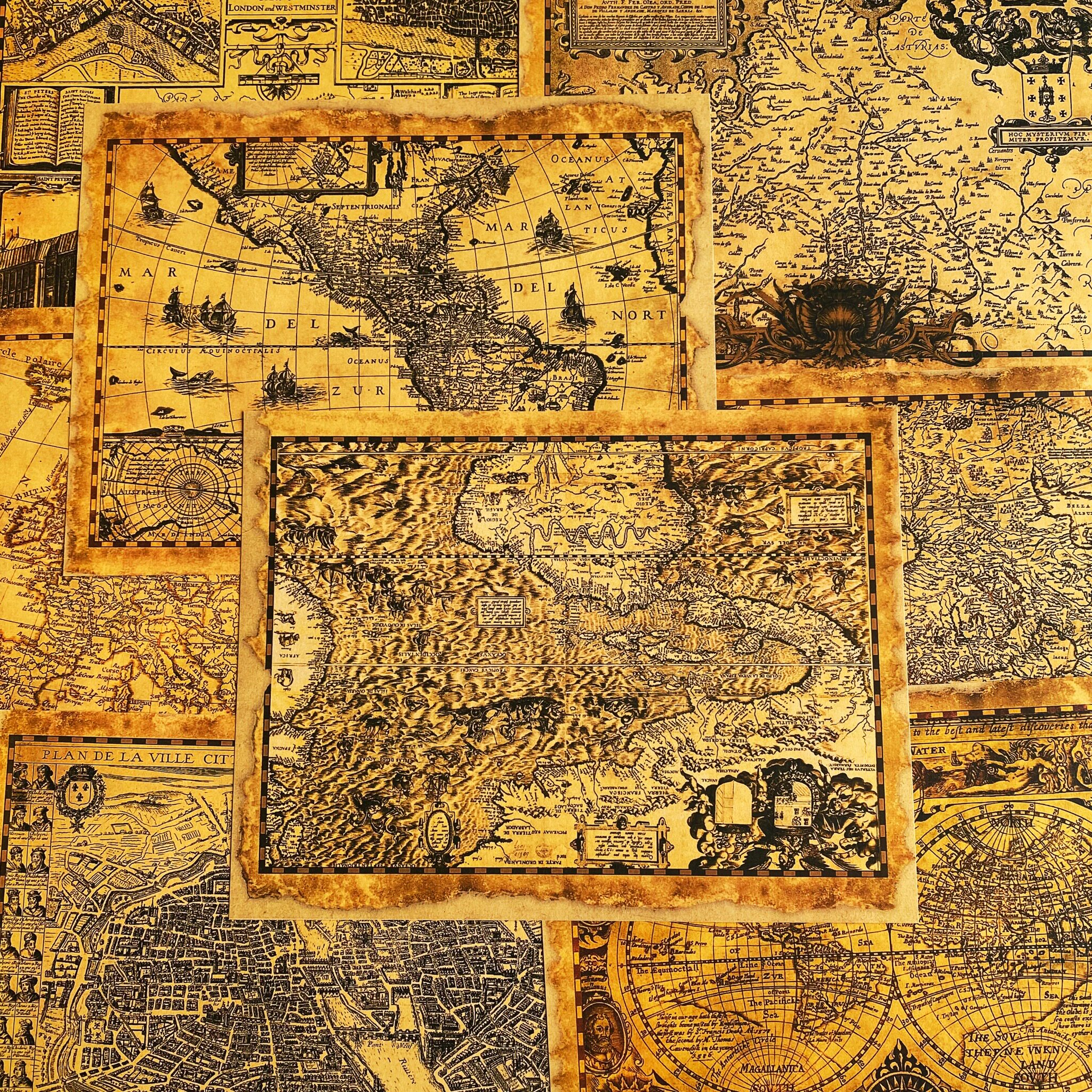 Vintage Golden Old Map Junk Journal Paper - 8 Pieces Kraft Paper Background for Scrapbooking & Art Journaling